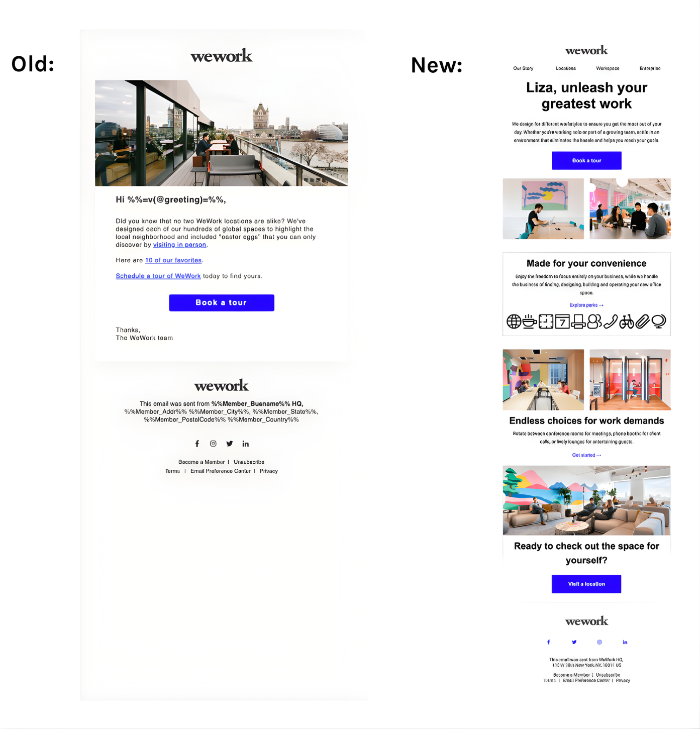 We Work’s marketing team wanted to update the brand’s email marketing journey. The goal with this project was to highlight We Work’s value propositions to potential new members and ultimately encourage them to book a tour.