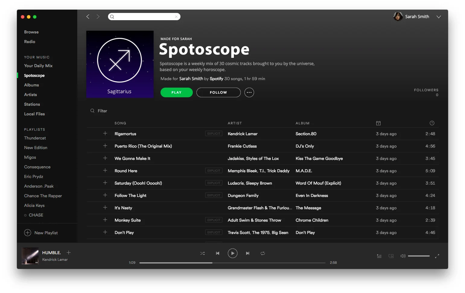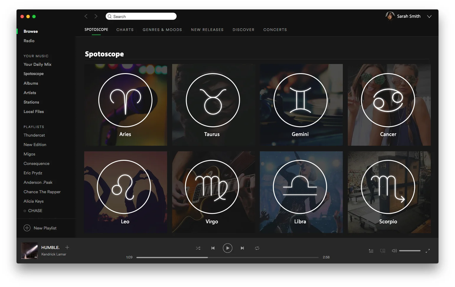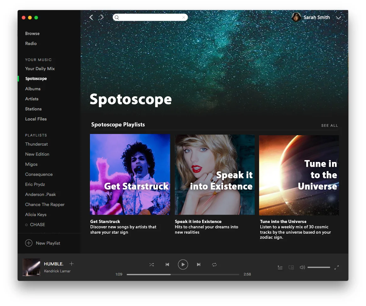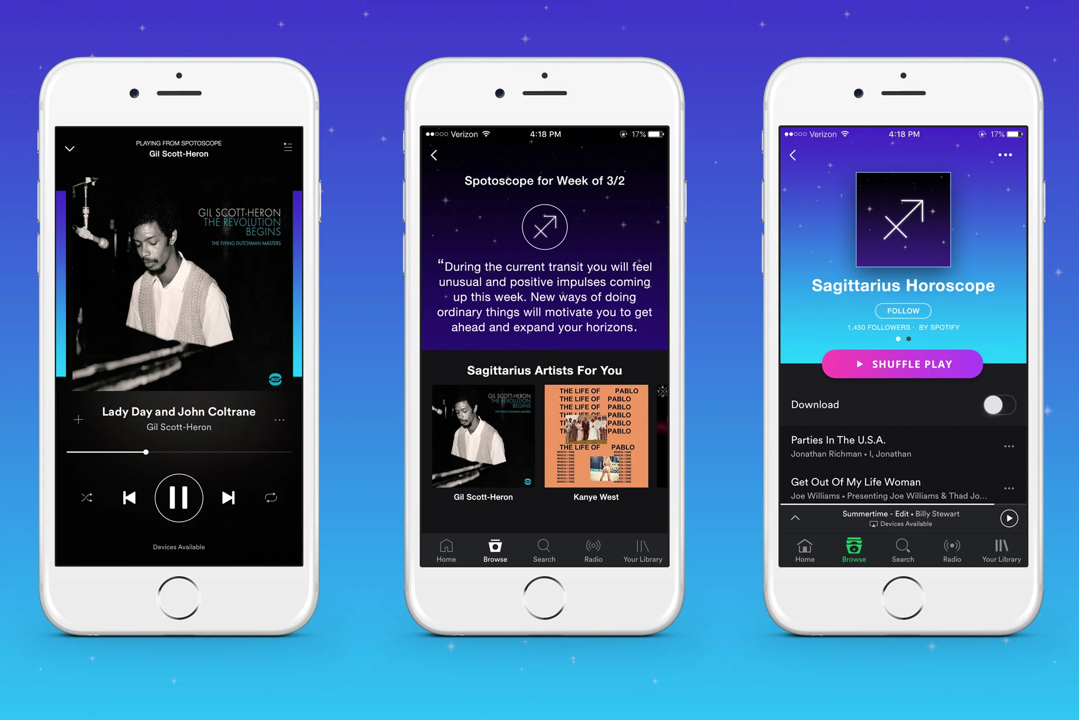 What if you could hear what your horoscope sounded like? Spotoscope is a mix of curated songs based on your zodiac sign and weekly horoscope. Whether your week is going to be full of adventure or full of dread, Spotoscope has just the right song to align you with the universe.